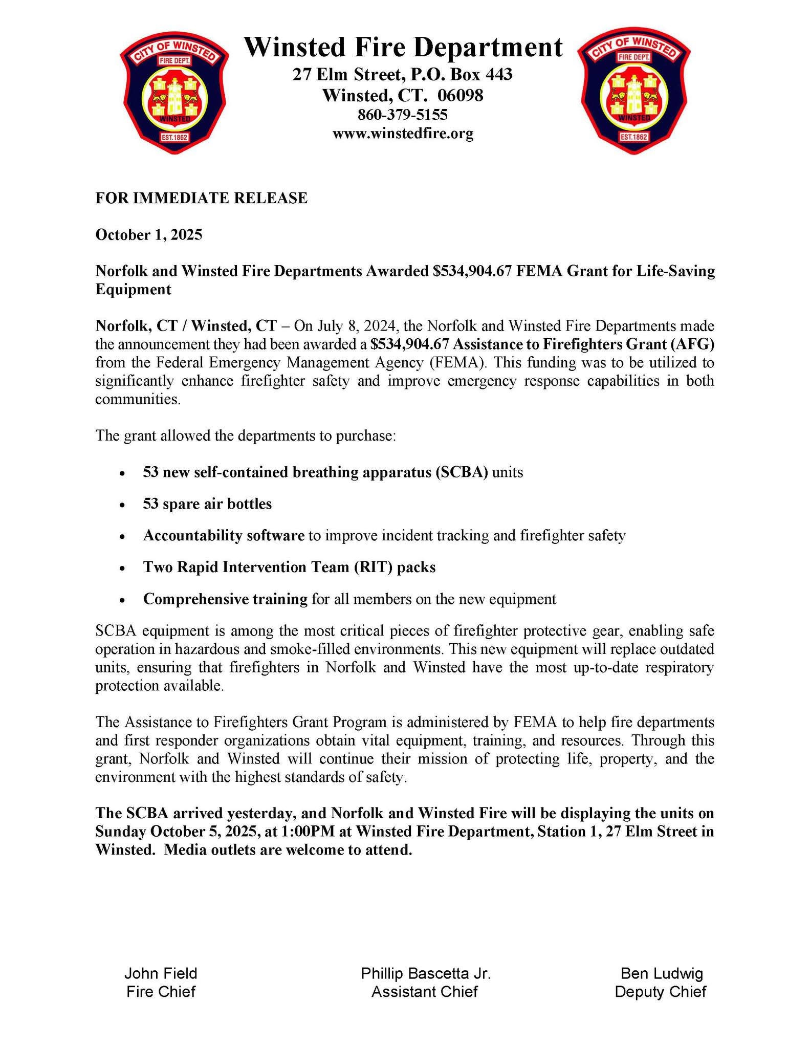 The Assistance to Firefighters Grant Program is administered by FEMA to help fire departments and first responder organizations obtain vital equipment, training, and resources. Through this grant, Norfolk and Winsted will continue their mission of protecting life, property, and the environment with the highest standards of safety.